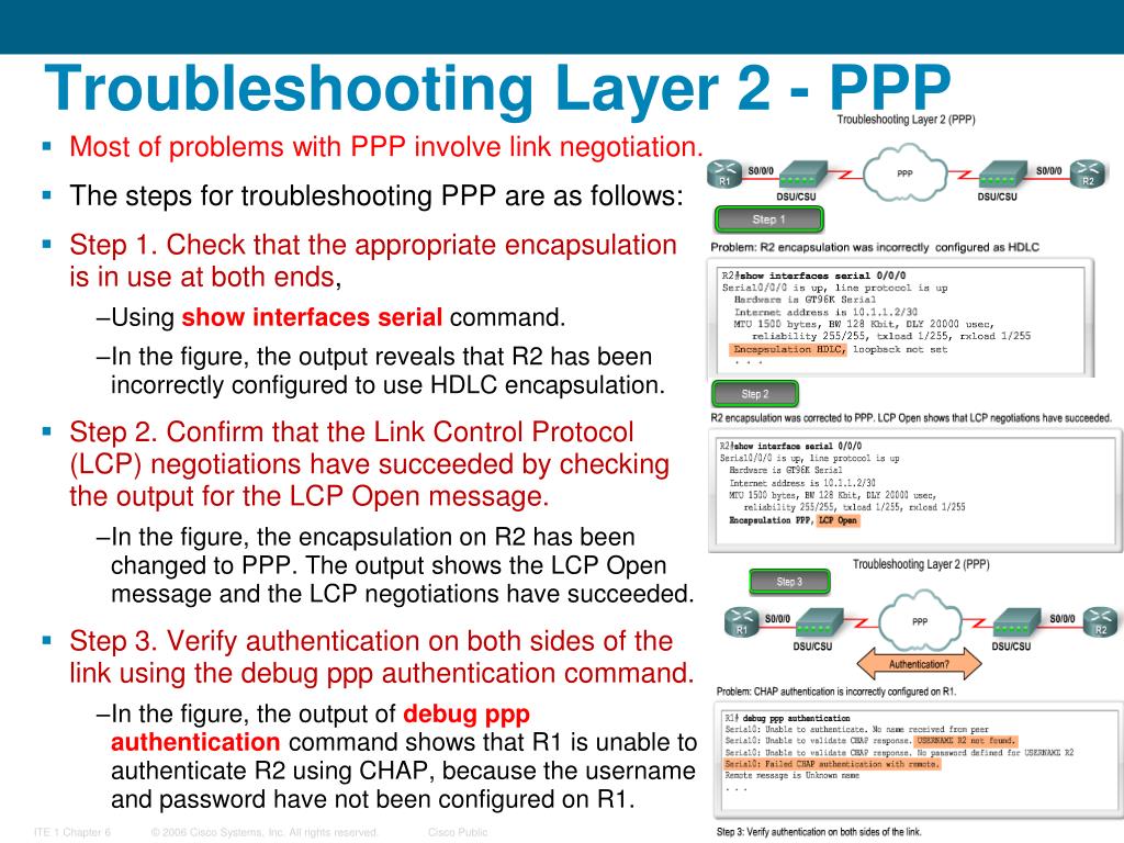 Troubleshooting Layer 2 - PPP • Most of problems with PPP involve link negotiation. • The steps for troubleshooting PPP are as follows: • Step 1. Check that the appropriate encapsulation is in use at both ends, • Using show interfaces serial command. • In the figure, the output reveals that R2 has been incorrectly configured to use HDLC encapsulation. • Step 2. Confirm that the Link Control Protocol (LCP) negotiations have succeeded by checking the output for the LCP Open message. • In the figure, the encapsulation on R2 has been changed to PPP. The output shows the LCP Open message and the LCP negotiations have succeeded. • Step 3. Verify authentication on both sides of the link using the debug ppp authentication command. • In the figure, the output of debug ppp authentication command shows that R1 is unable to authenticate R2 using CHAP, because the username and password have not been configured on R1.