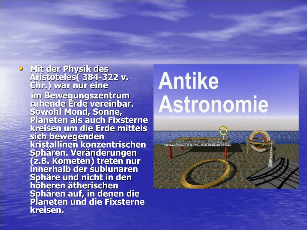 Mit der Physik des Aristoteles( 384-322 v. Chr.) war nur eine im Bewegungszentrum ruhende Erde vereinbar. Sowohl Mond, Sonne, Planeten als auch Fixsterne kreisen um die Erde mittels sich bewegenden kristallinen konzentrischen Sphären. Veränderungen (z.B. Kometen) treten nur innerhalb der sublunaren Sphäre und nicht in den höheren ätherischen Sphären auf, in denen die Planeten und die Fixsterne kreisen.