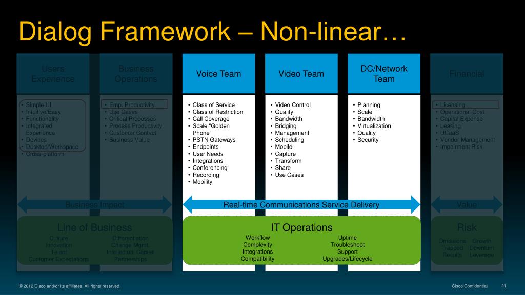 Dialog Framework – Non-linear… Users Experience Business Operations Voice Team Video Team DC/Network Team Financial • Video Control • Quality • Bandwidth • Bridging • Management • Scheduling • Mobile • Capture • Transform • Share • Use Cases • Class of Service • Class of Restriction • Call Coverage • Scale “Golden Phone” • PSTN Gateways • Endpoints • User Needs • Integrations • Conferencing • Recording • Mobility • Licensing • Operational Cost • Capital Expense • Leasing • UCaaS • Vendor Management • Impairment Risk • Simple UI • Intuitive/Easy • Functionality • Integrated Experience • Devices • Desktop/Workspace • Cross-platform • Emp. Productivity • Use Cases • Critical Processes • Process Productivity • Customer Contact • Business Value • Planning • Scale • Bandwidth • Virtualization • Quality • Security Business Impact Real-time Communications Service Delivery Value Line of Business IT Operations Risk Workflow Complexity Integrations Compatibility Uptime Troubleshoot Support Upgrades/Lifecycle Culture Innovation Talent Customer Expectations Differentiation Change Mgmt. Intellectual Capital Partnerships Omissions Trapped Results Growth Downturn Leverage