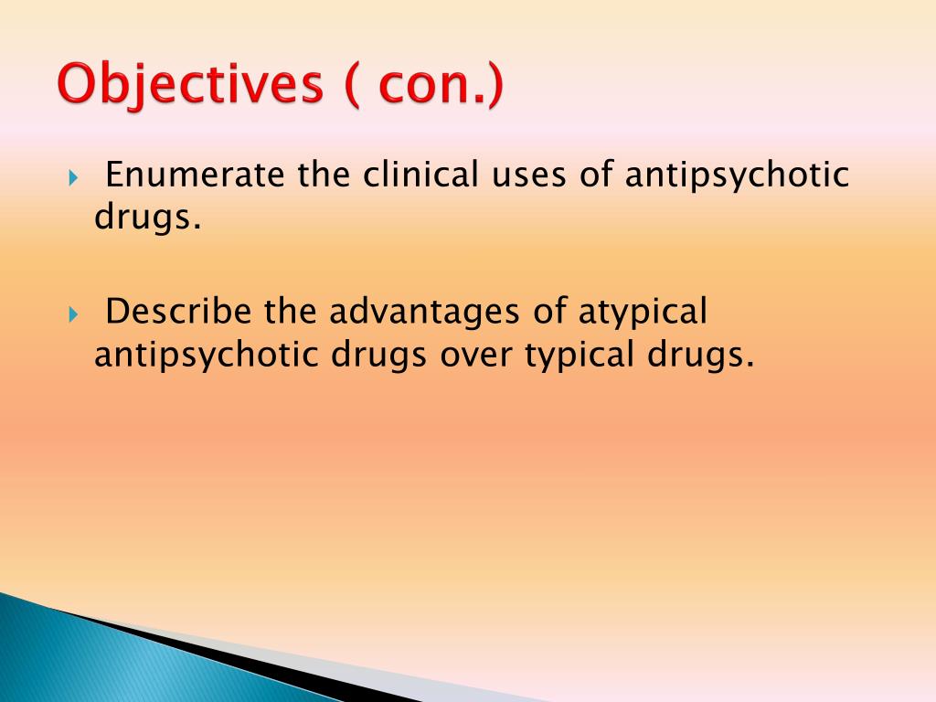 Objectives ( con.) • Enumerate the clinical uses of antipsychotic drugs. • Describe the advantages of atypical antipsychotic drugs over typical drugs.