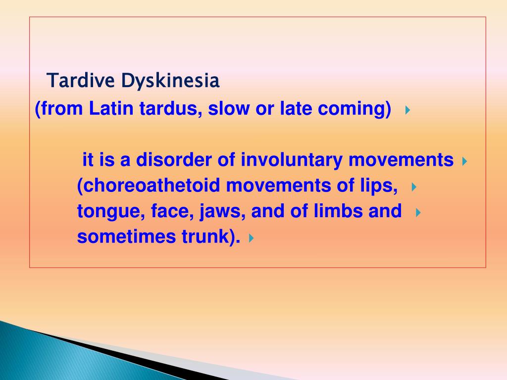 Tardive Dyskinesia • (from Latin tardus, slow or late coming) • it is a disorder of involuntary movements • (choreoathetoid movements of lips, • tongue, face, jaws, and of limbs and • sometimes trunk).