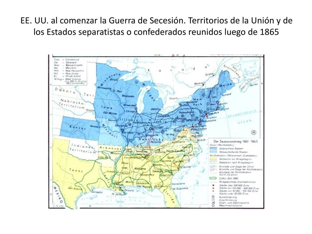 EE. UU. al comenzar la Guerra de Secesión. Territorios de la Unión y de los Estados separatistas o confederados reunidos luego de 1865