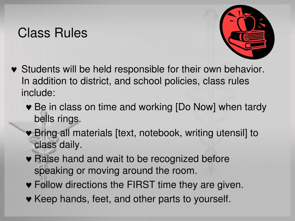 Class Rules • Students will be held responsible for their own behavior. In addition to district, and school policies, class rules include: • Be in class on time and working [Do Now] when tardy bells rings. • Bring all materials [text, notebook, writing utensil] to class daily. • Raise hand and wait to be recognized before speaking or moving around the room. • Follow directions the FIRST time they are given. • Keep hands, feet, and other parts to yourself.