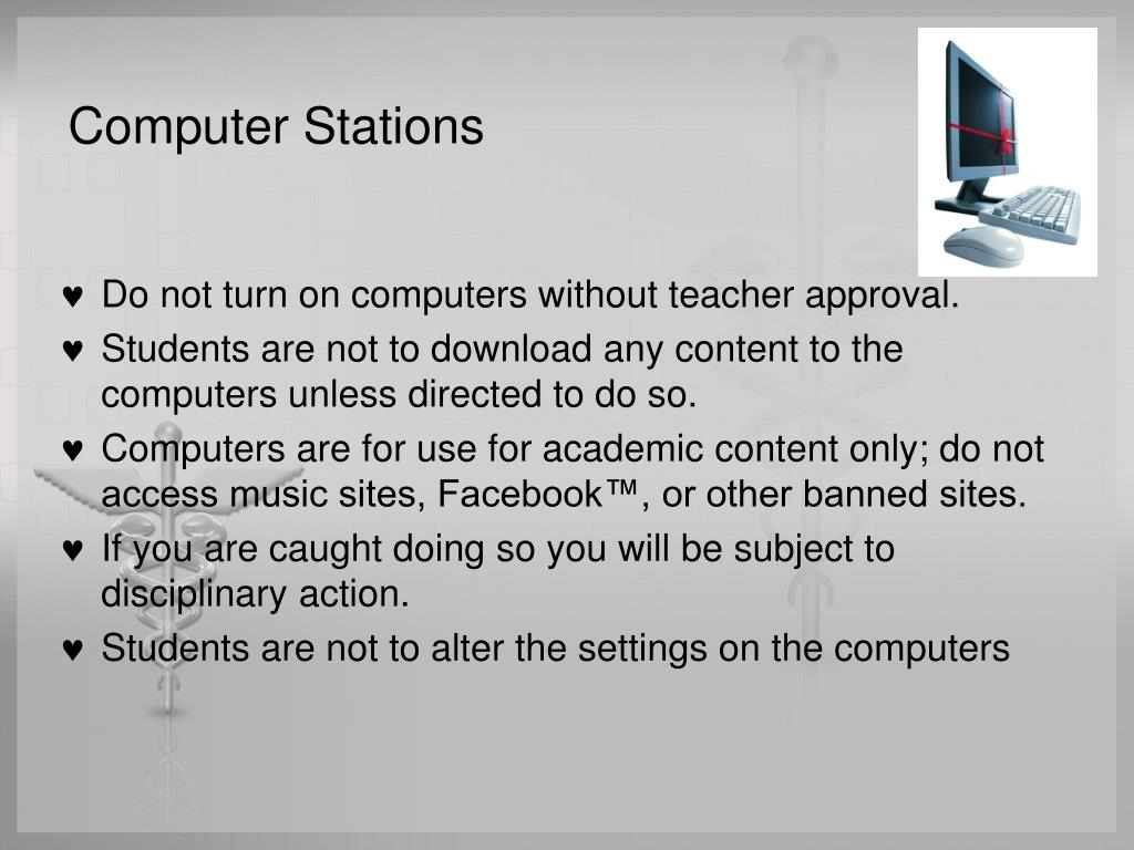 Computer Stations • Do not turn on computers without teacher approval. • Students are not to download any content to the computers unless directed to do so. • Computers are for use for academic content only; do not access music sites, Facebook™, or other banned sites. • If you are caught doing so you will be subject to disciplinary action. • Students are not to alter the settings on the computers