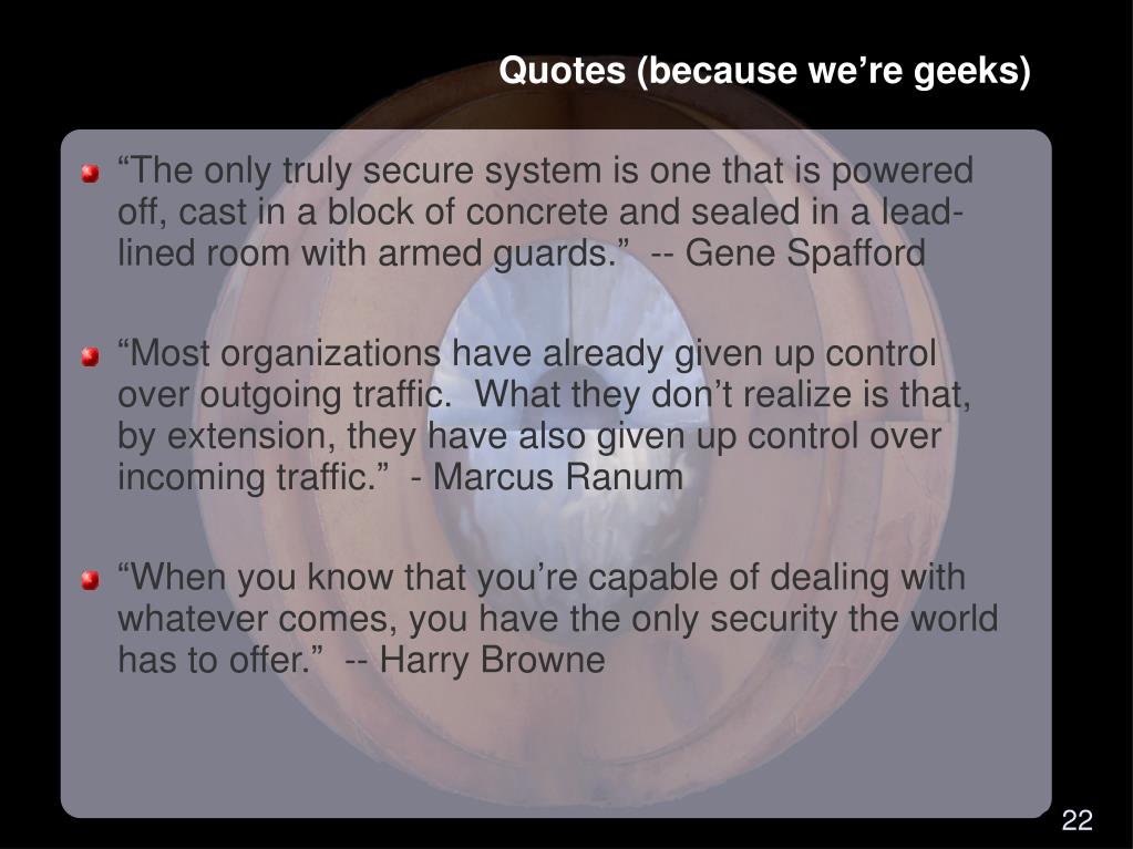 Quotes (because we’re geeks) • “The only truly secure system is one that is powered off, cast in a block of concrete and sealed in a lead-lined room with armed guards.” -- Gene Spafford • “Most organizations have already given up control over outgoing traffic. What they don’t realize is that, by extension, they have also given up control over incoming traffic.” - Marcus Ranum • “When you know that you’re capable of dealing with whatever comes, you have the only security the world has to offer.” -- Harry Browne