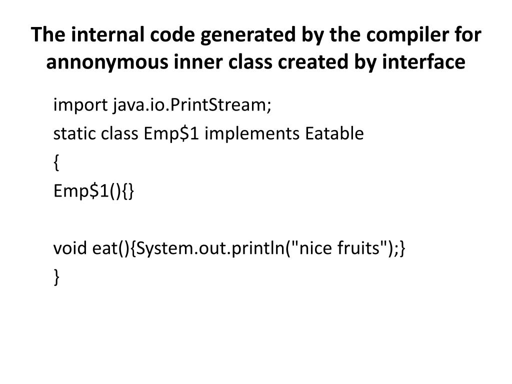 The internal code generated by the compiler for annonymous inner class created by interface import java.io.PrintStream; static class Emp$1 implements Eatable { Emp$1(){} void eat(){System.out.println("nice fruits");} }