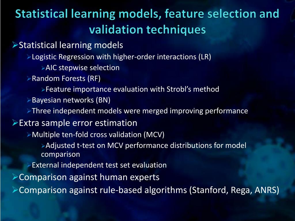 Statistical learning models, feature selection and validation techniques Statisticallearningmodels LogisticRegressionwithhigher-orderinteractions (LR) AIC stepwiseselection RandomForests (RF) FeatureimportanceevaluationwithStrobl’s method Bayesiannetworks (BN) Three independentmodelsweremergedimproving performance Extra sample errorestimation Multiple ten-fold cross validation (MCV) Adjusted t-test on MCV performance distributionsformodelcomparison Externalindependent test set evaluation Comparisonagainsthumanexperts Comparisonagainstrule-basedalgorithms (Stanford, Rega, ANRS)
