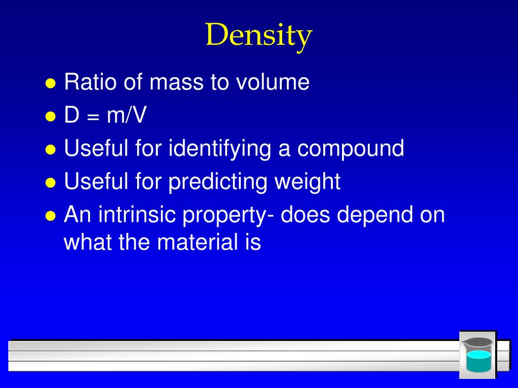 Density • Ratio of mass to volume • D = m/V • Useful for identifying a compound • Useful for predicting weight • An intrinsic property- does depend on what the material is