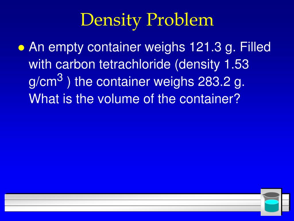 Density Problem • An empty container weighs 121.3 g. Filled with carbon tetrachloride (density 1.53 g/cm3 ) the container weighs 283.2 g. What is the volume of the container?