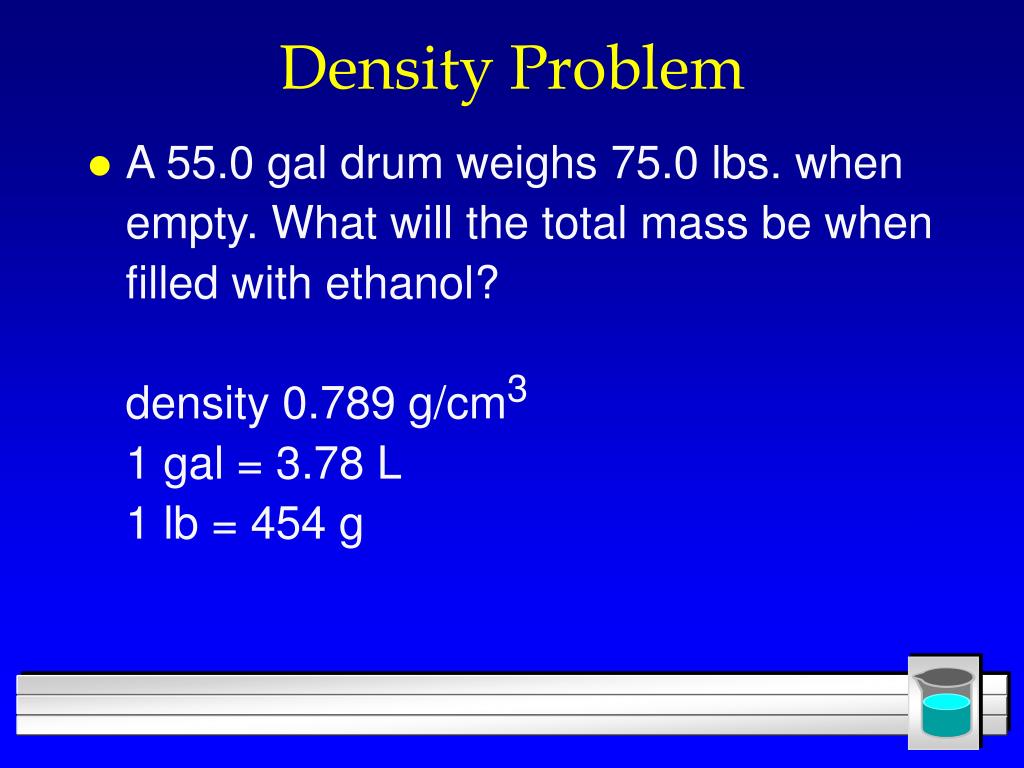 Density Problem • A 55.0 gal drum weighs 75.0 lbs. when empty. What will the total mass be when filled with ethanol? density 0.789 g/cm3 1 gal = 3.78 L 1 lb = 454 g