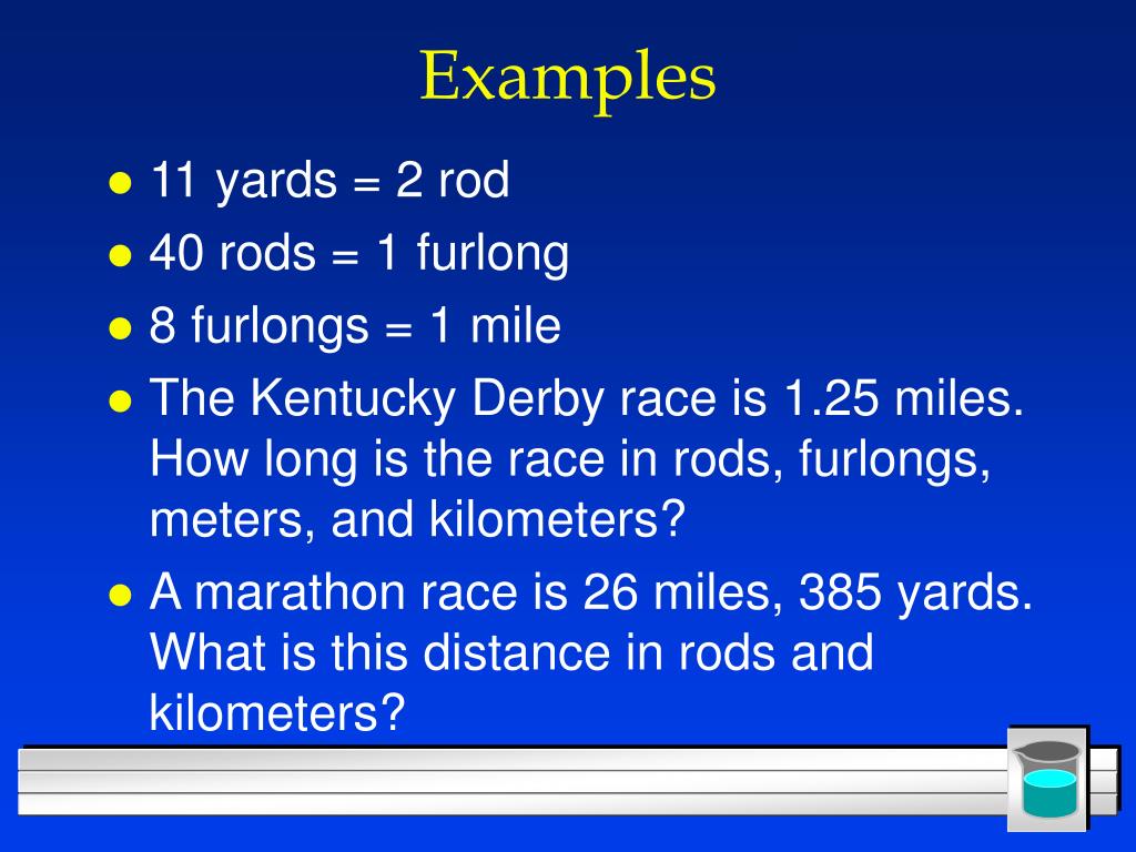 Examples • 11 yards = 2 rod • 40 rods = 1 furlong • 8 furlongs = 1 mile • The Kentucky Derby race is 1.25 miles. How long is the race in rods, furlongs, meters, and kilometers? • A marathon race is 26 miles, 385 yards. What is this distance in rods and kilometers?