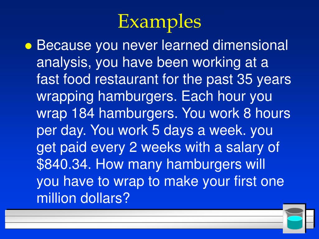 Examples • Because you never learned dimensional analysis, you have been working at a fast food restaurant for the past 35 years wrapping hamburgers. Each hour you wrap 184 hamburgers. You work 8 hours per day. You work 5 days a week. you get paid every 2 weeks with a salary of $840.34. How many hamburgers will you have to wrap to make your first one million dollars?