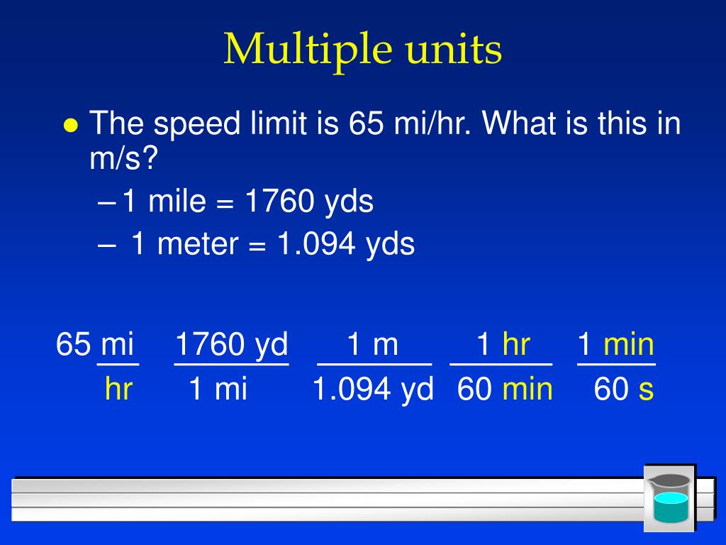 65 mi hr Multiple units • The speed limit is 65 mi/hr. What is this in m/s? • 1 mile = 1760 yds • 1 meter = 1.094 yds 1760 yd 1 m 1 hr 1 min 1 mi 1.094 yd 60 min 60 s