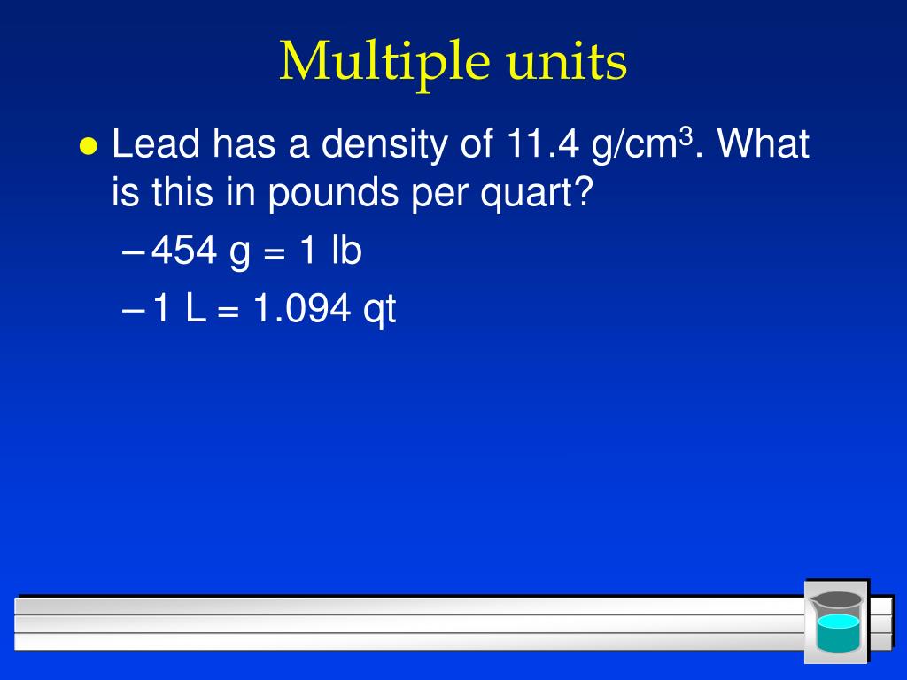 Multiple units • Lead has a density of 11.4 g/cm3. What is this in pounds per quart? • 454 g = 1 lb • 1 L = 1.094 qt