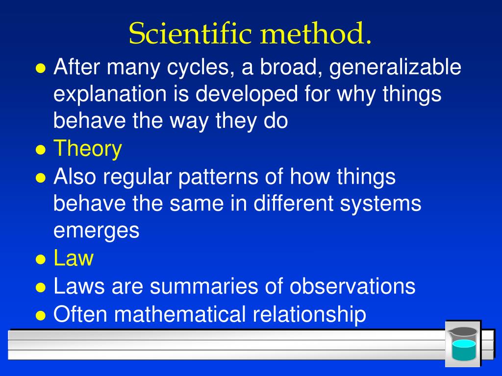 Scientific method. • After many cycles, a broad, generalizable explanation is developed for why things behave the way they do • Theory • Also regular patterns of how things behave the same in different systems emerges • Law • Laws are summaries of observations • Often mathematical relationship