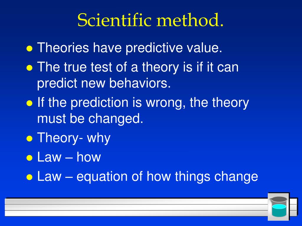 Scientific method. • Theories have predictive value. • The true test of a theory is if it can predict new behaviors. • If the prediction is wrong, the theory must be changed. • Theory- why • Law – how • Law – equation of how things change