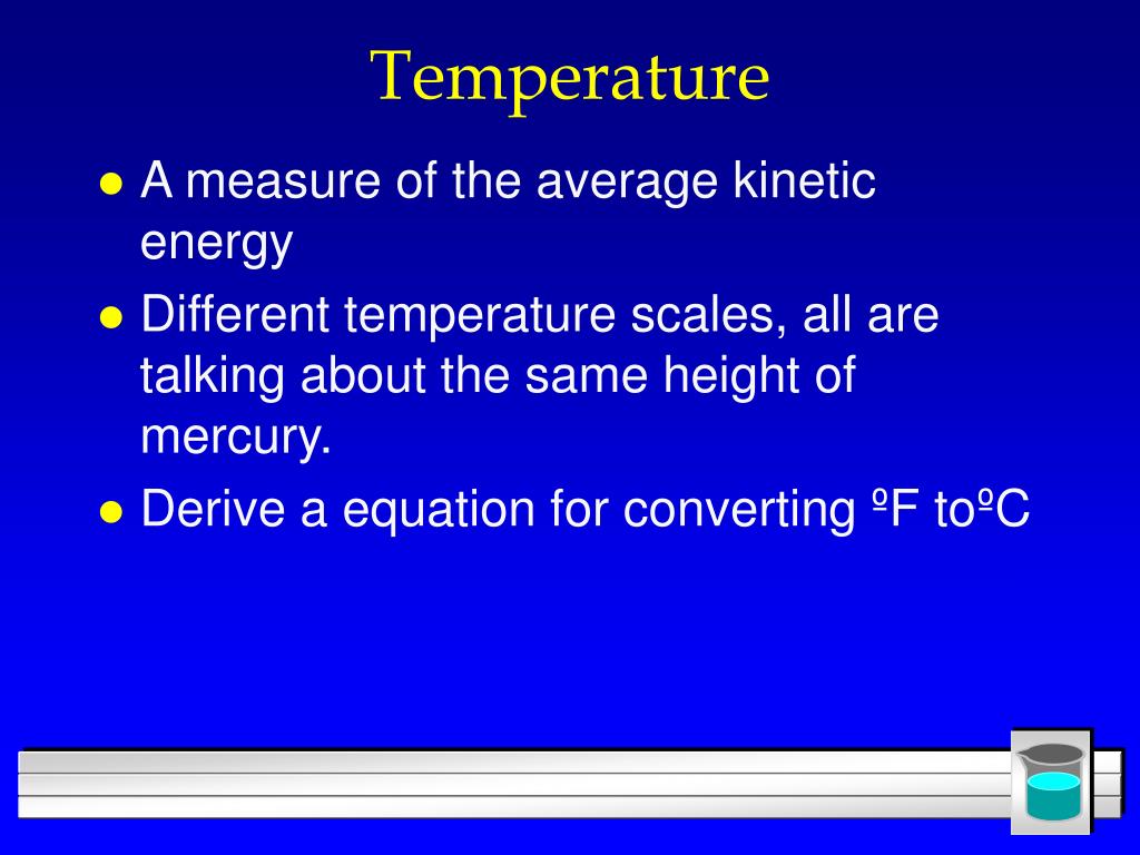 Temperature • A measure of the average kinetic energy • Different temperature scales, all are talking about the same height of mercury. • Derive a equation for converting ºF toºC