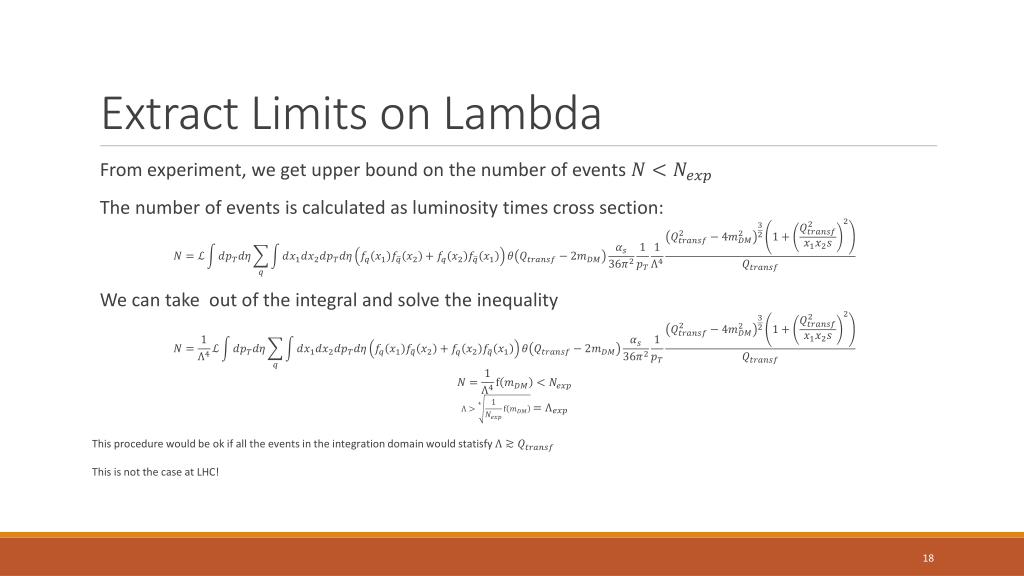 Extract Limits on Lambda • From experiment, we get upper bound on the number of events • The number of events is calculated as luminosity times cross section: • We can take out of the integral and solve the inequality This procedure would be ok ifall the events in the integration domain wouldstatisfy Thisisnot the case at LHC!