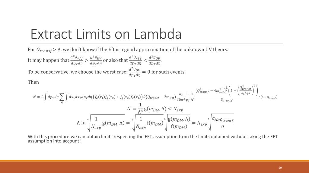 Extract Limits on Lambda For >, wedon’tknowif the Eftis a goodapproximation of the unknown UV theory. Itmayhappenthat or alsothat. To be conservative, wechoose the worst case: for suchevents. Then With this procedure we can obtainlimitsrespecting the EFT assumption from the limitsobtainedwithouttaking the EFT assumptioninto account!