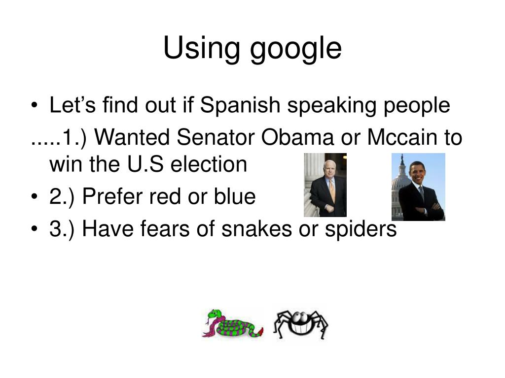 Using google • Let’s find out if Spanish speaking people .....1.) Wanted Senator Obama or Mccain to win the U.S election • 2.) Prefer red or blue • 3.) Have fears of snakes or spiders