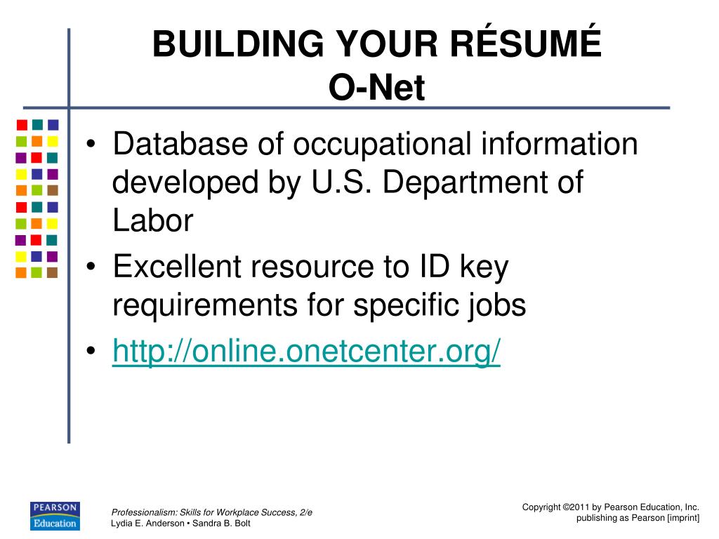 BUILDING YOUR RÉSUMÉ O-Net Database of occupational information developed by U.S. Department of Labor Excellent resource to ID key requirements for specific jobs http://online.onetcenter.org/