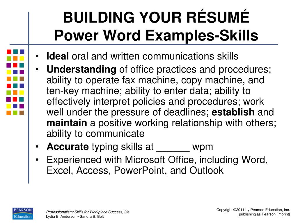 Ideal oral and written communications skills Understanding of office practices and procedures; ability to operate fax machine, copy machine, and ten-key machine; ability to enter data; ability to effectively interpret policies and procedures; work well under the pressure of deadlines; establish and maintain a positive working relationship with others; ability to communicate Accurate typing skills at ______ wpm Experienced with Microsoft Office, including Word, Excel, Access, PowerPoint, and Outlook BUILDING YOUR RÉSUMÉ Power Word Examples-Skills