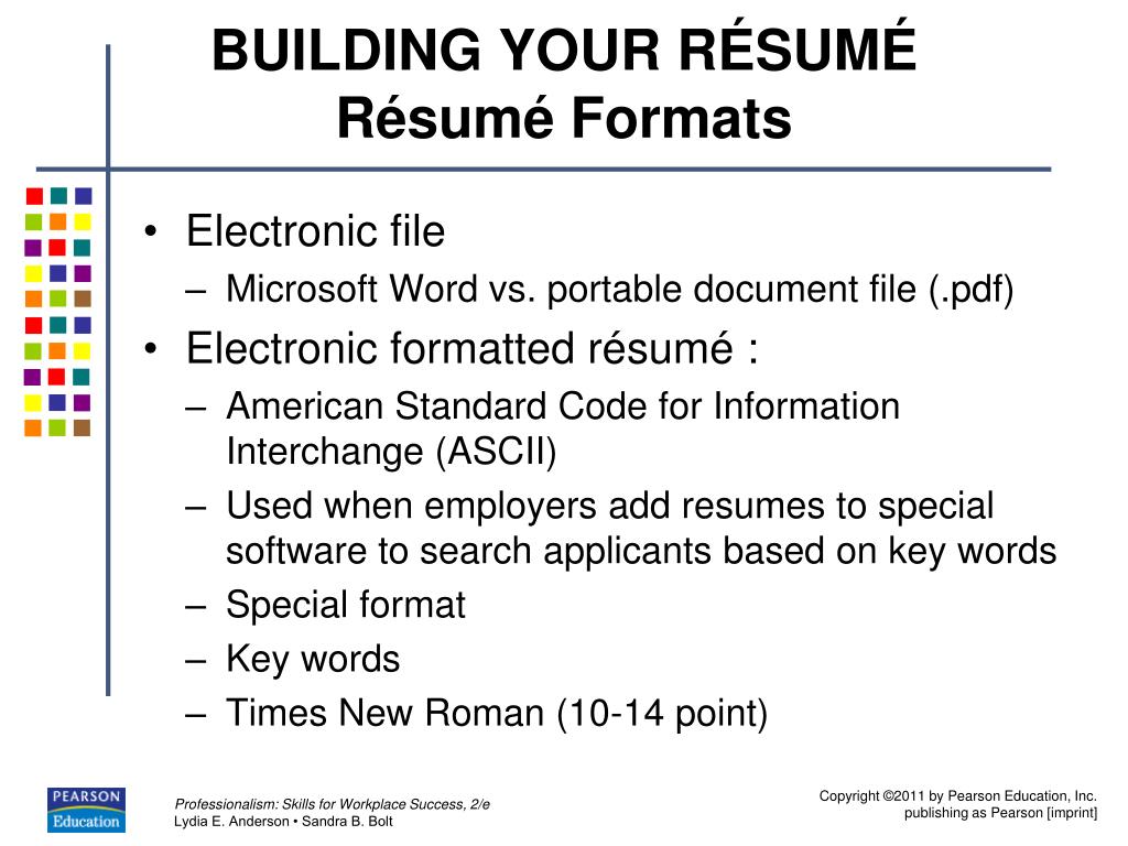 BUILDING YOUR RÉSUMÉ Résumé Formats Electronic file Microsoft Word vs. portable document file (.pdf) Electronic formatted résumé : American Standard Code for Information Interchange (ASCII) Used when employers add resumes to special software to search applicants based on key words Special format Key words Times New Roman (10-14 point)