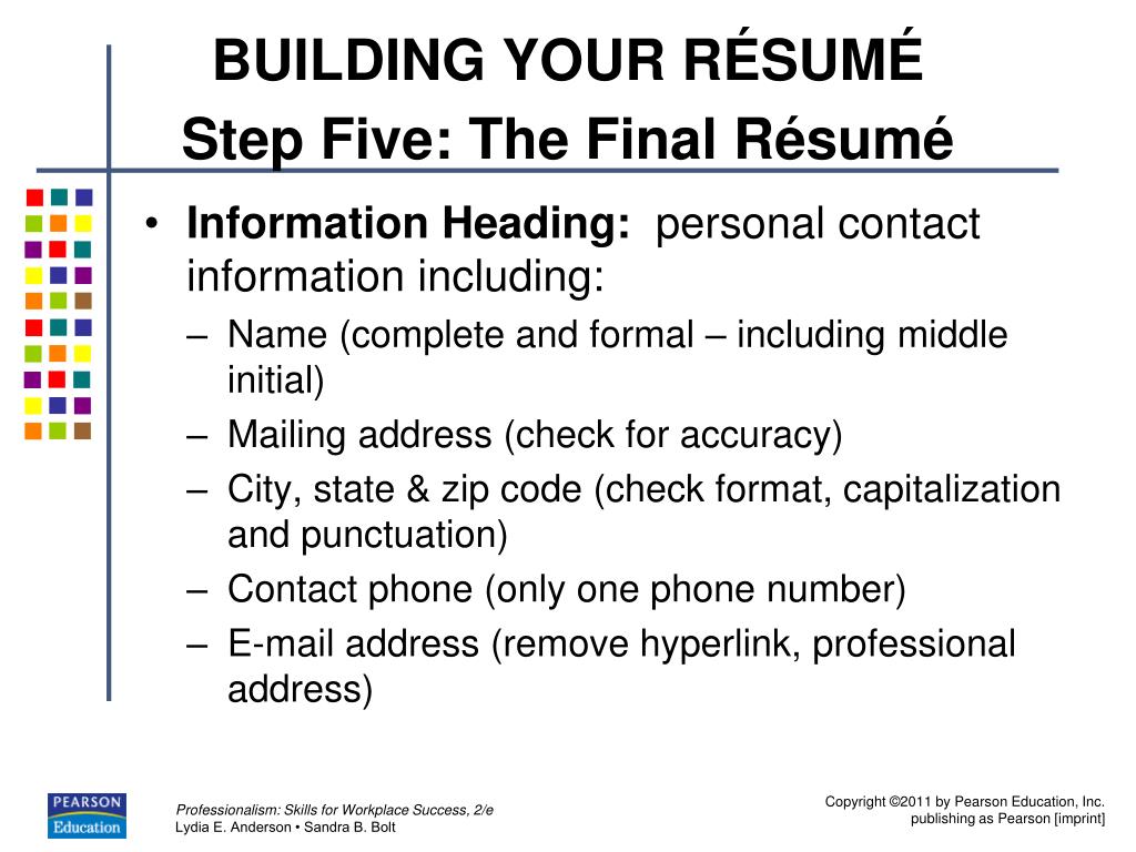 BUILDING YOUR RÉSUMÉ Step Five: The Final Résumé Information Heading: personal contact information including: Name (complete and formal – including middle initial) Mailing address (check for accuracy) City, state & zip code (check format, capitalization and punctuation) Contact phone (only one phone number) E-mail address (remove hyperlink, professional address)