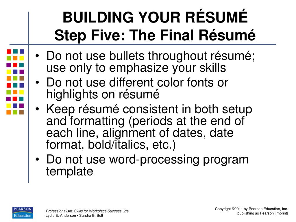 Do not use bullets throughout résumé; use only to emphasize your skills Do not use different color fonts or highlights on résumé Keep résumé consistent in both setup and formatting (periods at the end of each line, alignment of dates, date format, bold/italics, etc.) Do not use word-processing program template BUILDING YOUR RÉSUMÉ Step Five: The Final Résumé