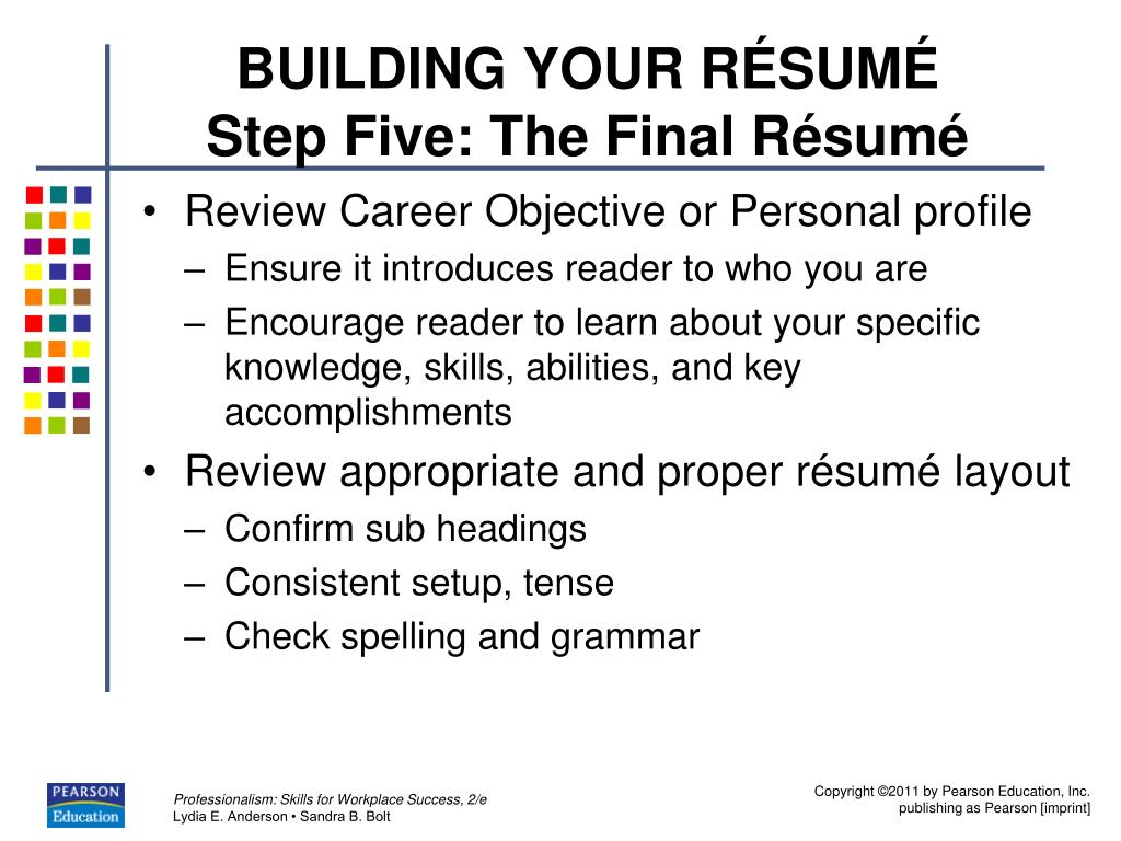 BUILDING YOUR RÉSUMÉ Step Five: The Final Résumé Review Career Objective or Personal profile Ensure it introduces reader to who you are Encourage reader to learn about your specific knowledge, skills, abilities, and key accomplishments Review appropriate and proper résumélayout Confirm sub headings Consistent setup, tense Check spelling and grammar
