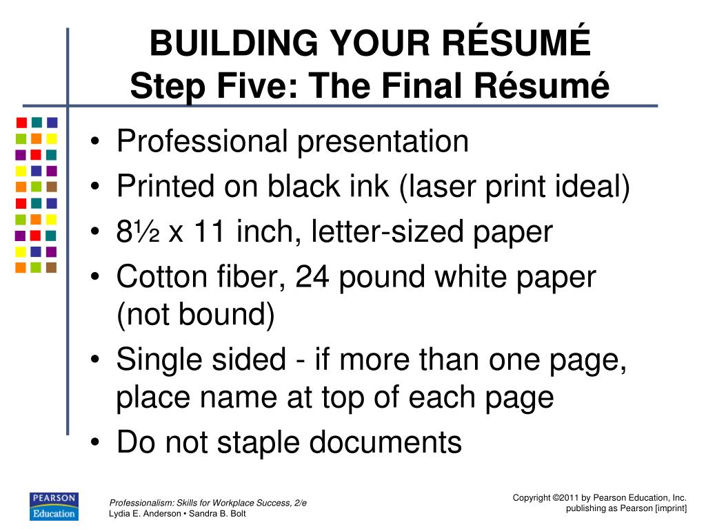 BUILDING YOUR RÉSUMÉ Step Five: The Final Résumé Professional presentation Printed on black ink (laser print ideal) 8½ x 11 inch, letter-sized paper Cotton fiber, 24 pound white paper (not bound) Single sided - if more than one page, place name at top of each page Do not staple documents