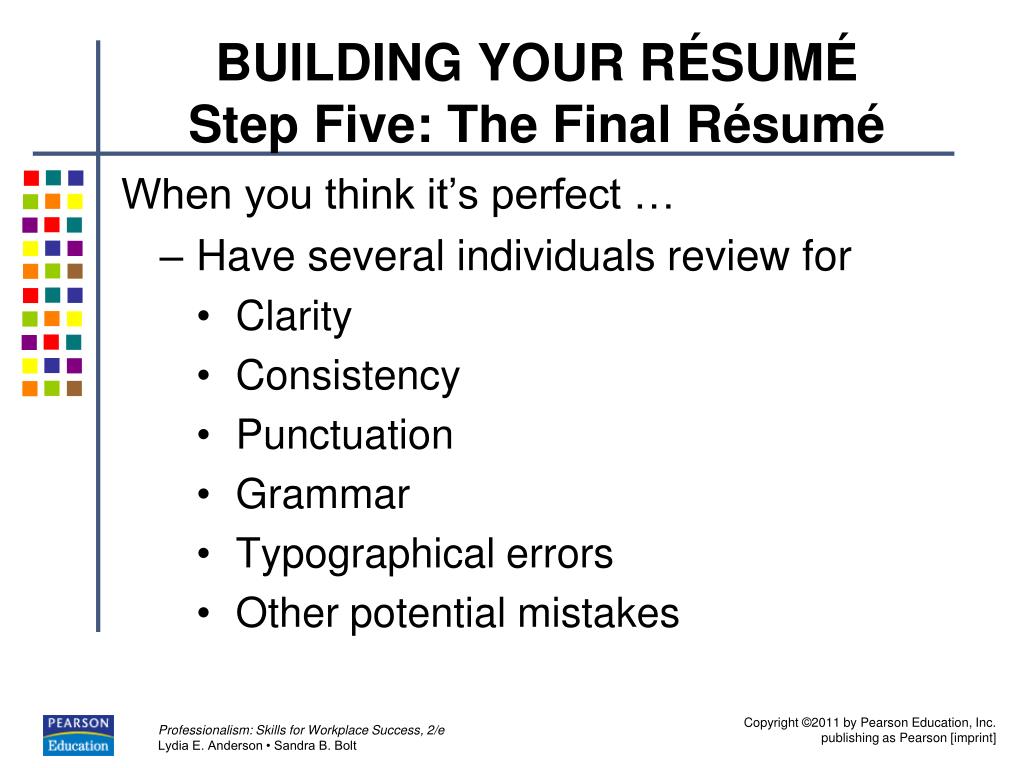 BUILDING YOUR RÉSUMÉ Step Five: The Final Résumé When you think it’s perfect … Have several individuals review for Clarity Consistency Punctuation Grammar Typographical errors Other potential mistakes