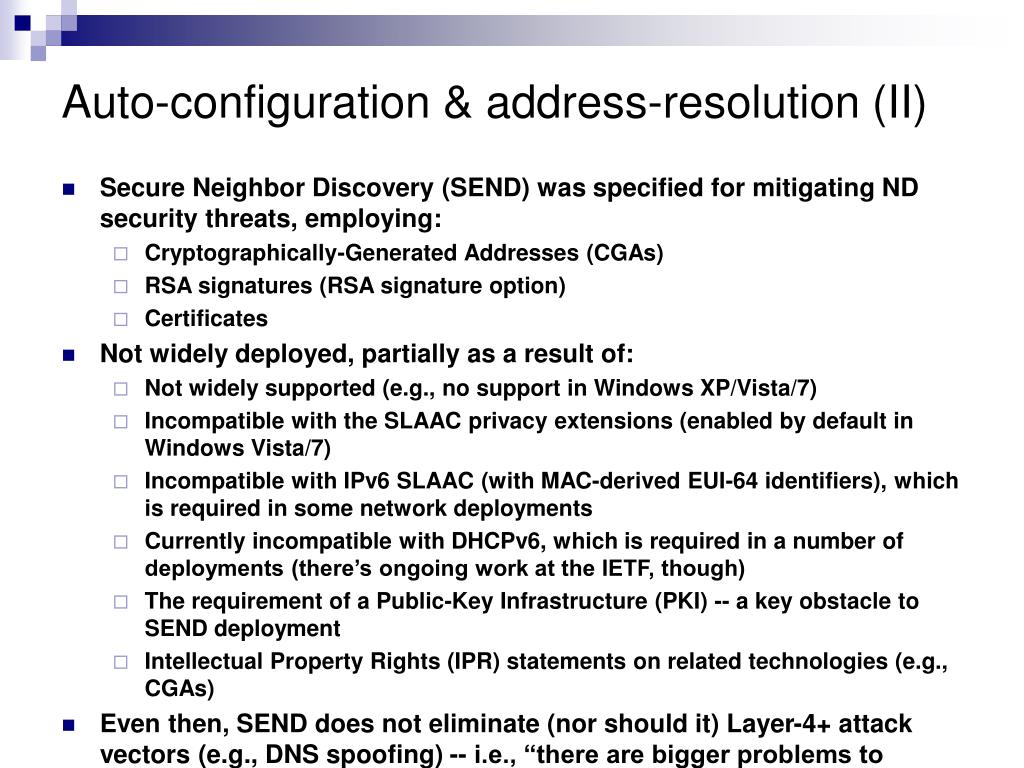 Auto-configuration & address-resolution (II) • Secure Neighbor Discovery (SEND) was specified for mitigating ND security threats, employing: • Cryptographically-Generated Addresses (CGAs) • RSA signatures (RSA signature option) • Certificates • Not widely deployed, partially as a result of: • Not widely supported (e.g., no support in Windows XP/Vista/7) • Incompatible with the SLAAC privacy extensions (enabled by default in Windows Vista/7) • Incompatible with IPv6 SLAAC (with MAC-derived EUI-64 identifiers), which is required in some network deployments • Currently incompatible with DHCPv6, which is required in a number of deployments (there’s ongoing work at the IETF, though) • The requirement of a Public-Key Infrastructure (PKI) -- a key obstacle to SEND deployment • Intellectual Property Rights (IPR) statements on related technologies (e.g., CGAs) • Even then, SEND does not eliminate (nor should it) Layer-4+ attack vectors (e.g., DNS spoofing) -- i.e., “there are bigger problems to solve”
