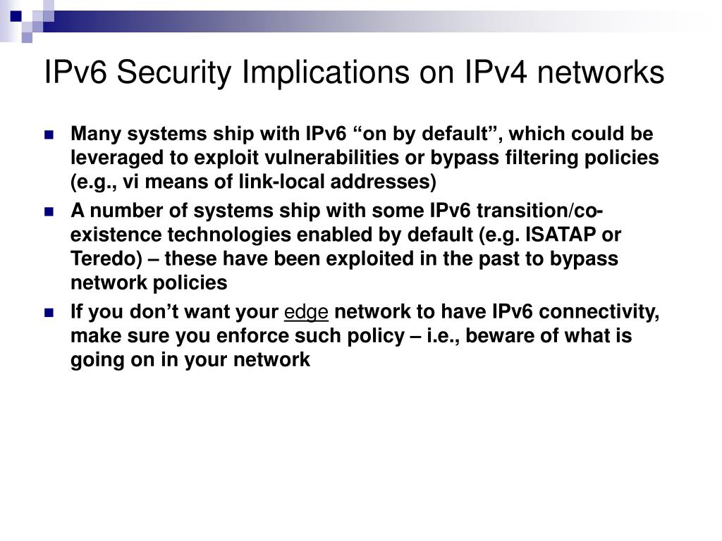 IPv6 Security Implications on IPv4 networks • Many systems ship with IPv6 “on by default”, which could be leveraged to exploit vulnerabilities or bypass filtering policies (e.g., vi means of link-local addresses) • A number of systems ship with some IPv6 transition/co-existence technologies enabled by default (e.g. ISATAP or Teredo) – these have been exploited in the past to bypass network policies • If you don’t want your edge network to have IPv6 connectivity, make sure you enforce such policy – i.e., beware of what is going on in your network