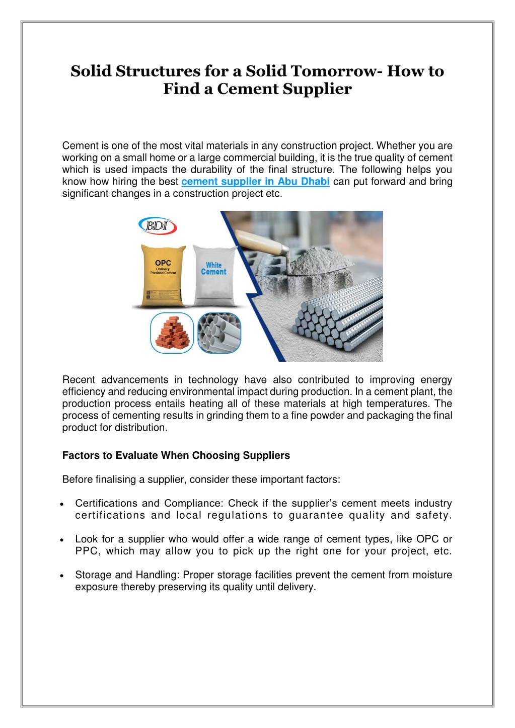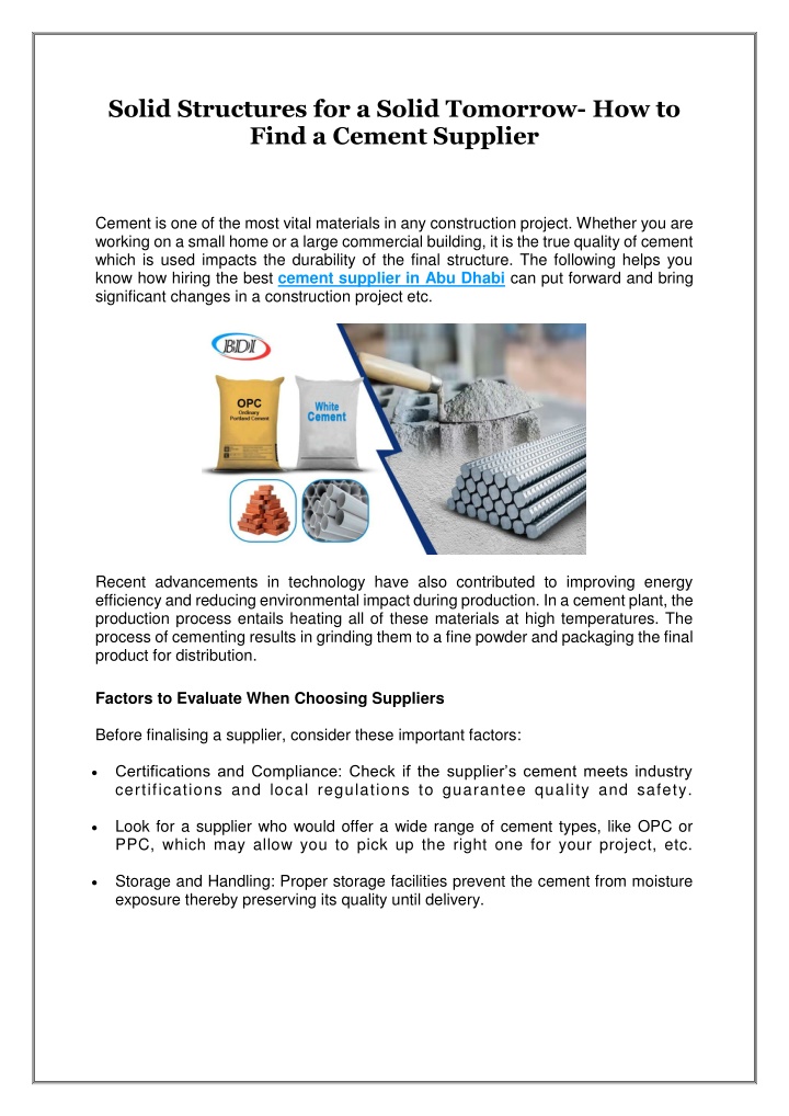 Solid Structures for a Solid Tomorrow- How to Find a Cement Supplier Cement is one of the most vital materials in any construction project. Whether you are working on a small home or a large commercial building, it is the true quality of cement which is used impacts the durability of the final structure. The following helps you know how hiring the best cement supplier in Abu Dhabi can put forward and bring significant changes in a construction project etc. Recent advancements in technology have also contributed to improving energy efficiency and reducing environmental impact during production. In a cement plant, the production process entails heating all of these materials at high temperatures. The process of cementing results in grinding them to a fine powder and packaging the final product for distribution. Factors to Evaluate When Choosing Suppliers Before finalising a supplier, consider these important factors: Certifications and Compliance: Check if the supplier’s cement meets industry certifications and local regulations to guarantee quality and safety. Look for a supplier who would offer a wide range of cement types, like OPC or PPC, which may allow you to pick up the right one for your project, etc. Storage and Handling: Proper storage facilities prevent the cement from moisture exposure thereby preserving its quality until delivery.