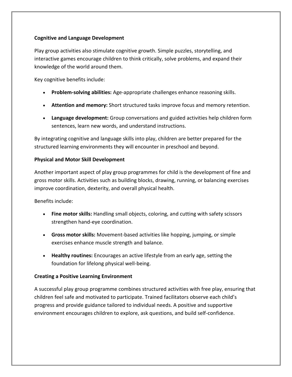 Cognitive and Language Development Play group activities also stimulate cognitive growth. Simple puzzles, storytelling, and interactive games encourage children to think critically, solve problems, and expand their knowledge of the world around them. Key cognitive benefits include: •Problem-solving abilities: Age-appropriate challenges enhance reasoning skills. •Attention and memory: Short structured tasks improve focus and memory retention. •Language development: Group conversations and guided activities help children form sentences, learn new words, and understand instructions. By integrating cognitive and language skills into play, children are better prepared for the structured learning environments they will encounter in preschool and beyond. Physical and Motor Skill Development Another important aspect of play group programmes for child is the development of fine and gross motor skills. Activities such as building blocks, drawing, running, or balancing exercises improve coordination, dexterity, and overall physical health. Benefits include: •Fine motor skills: Handling small objects, coloring, and cutting with safety scissors strengthen hand-eye coordination. •Gross motor skills: Movement-based activities like hopping, jumping, or simple exercises enhance muscle strength and balance. •Healthy routines: Encourages an active lifestyle from an early age, setting the foundation for lifelong physical well-being. Creating a Positive Learning Environment A successful play group programme combines structured activities with free play, ensuring that children feel safe and motivated to participate. Trained facilitators observe each child’s progress and provide guidance tailored to individual needs. A positive and supportive environment encourages children to explore, ask questions, and build self-confidence.
