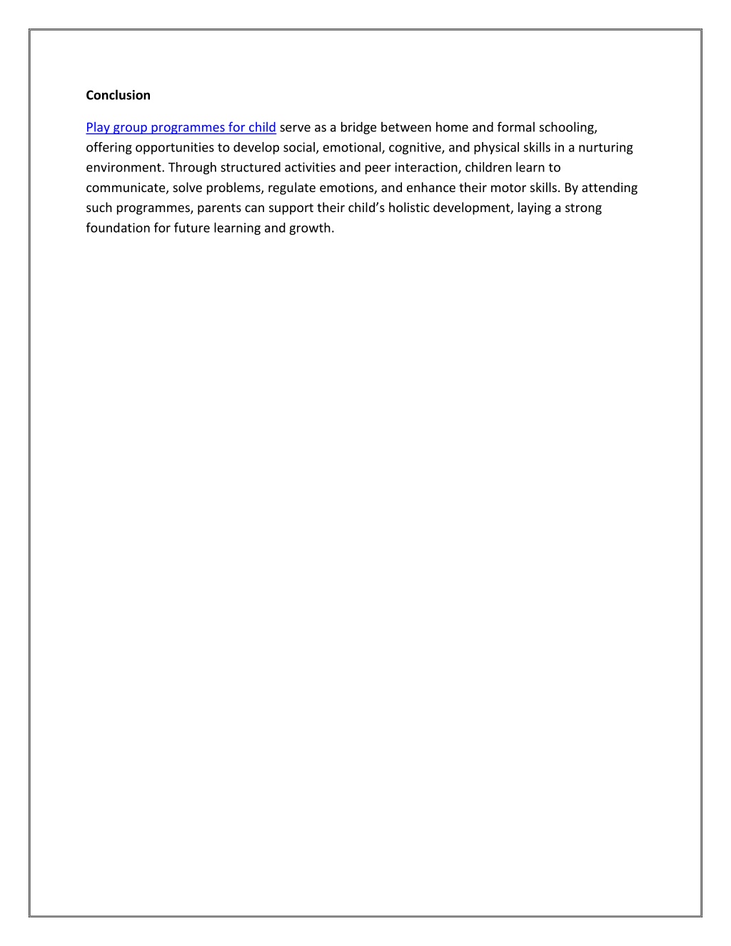 Conclusion Play group programmes for child serve as a bridge between home and formal schooling, offering opportunities to develop social, emotional, cognitive, and physical skills in a nurturing environment. Through structured activities and peer interaction, children learn to communicate, solve problems, regulate emotions, and enhance their motor skills. By attending such programmes, parents can support their child’s holistic development, laying a strong foundation for future learning and growth.
