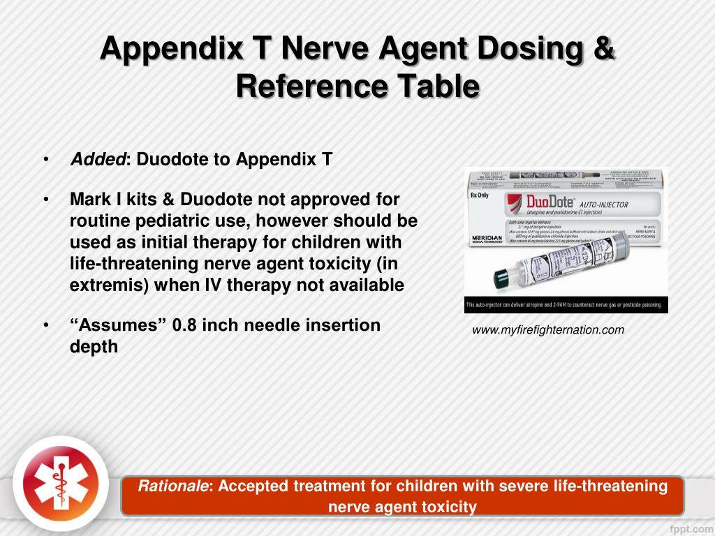 Appendix T Nerve Agent Dosing & Reference Table • Added: Duodote to Appendix T • Mark I kits & Duodote not approved for routine pediatric use, however should be used as initial therapy for children with life-threatening nerve agent toxicity (in extremis) when IV therapy not available • “Assumes” 0.8 inch needle insertion depth www.myfirefighternation.com Rationale: Accepted treatment for children with severe life-threatening nerve agent toxicity