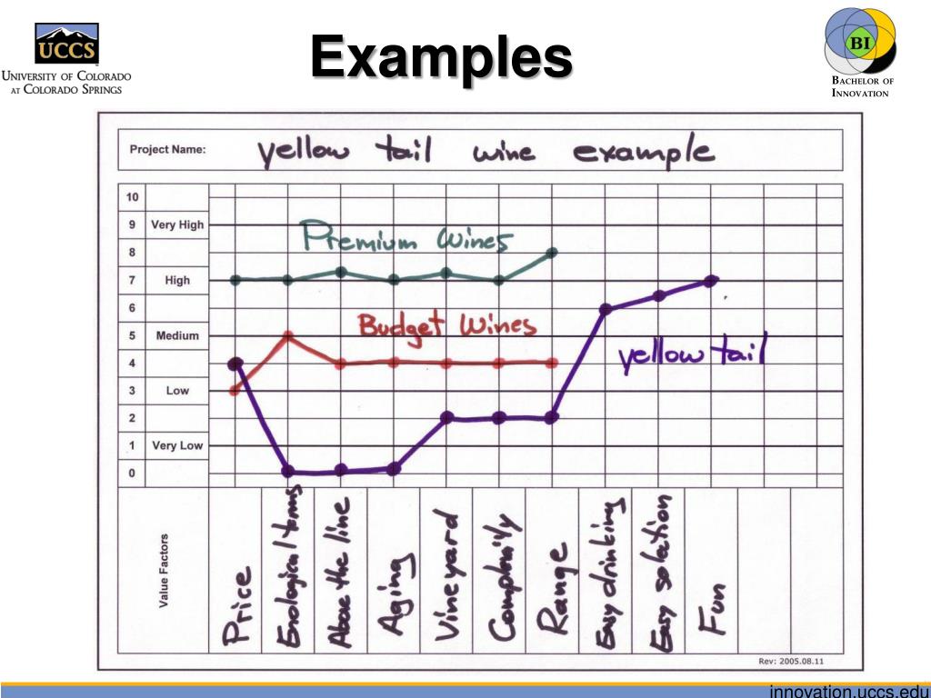 Strategy Canvas The strategy canvas is both a diagnostic and an action framework for building a compelling blue ocean strategy. It captures the current state of play in the known market space. This allows you to understand where the competition is currently investing, the factors the industry currently competes on in products, service, and delivery, and what customers receive from the existing competitive offerings on the market. The horizontal axis captures the range of factors the industry competes on an invests in. The vertical axis captures the offering level that buyers receive across all these key competing factors. The value curve then provides a graphic depiction of a company’s relative performance across its industry’s factors of competition. High Premium Wines Budget Wines Low Wine range Above-the-line marketing Vineyard prestige and legacy Price Use of enological terminology Aging quality Wine complexity