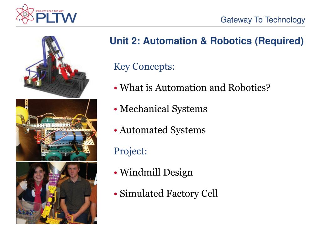 Gateway To Technology - 7 Units • Middle School curriculum (grades 6-8) • 45 instructional days per unit • 1.75 years of curriculum • Two required units • Design and Modeling • Automation and Robotics