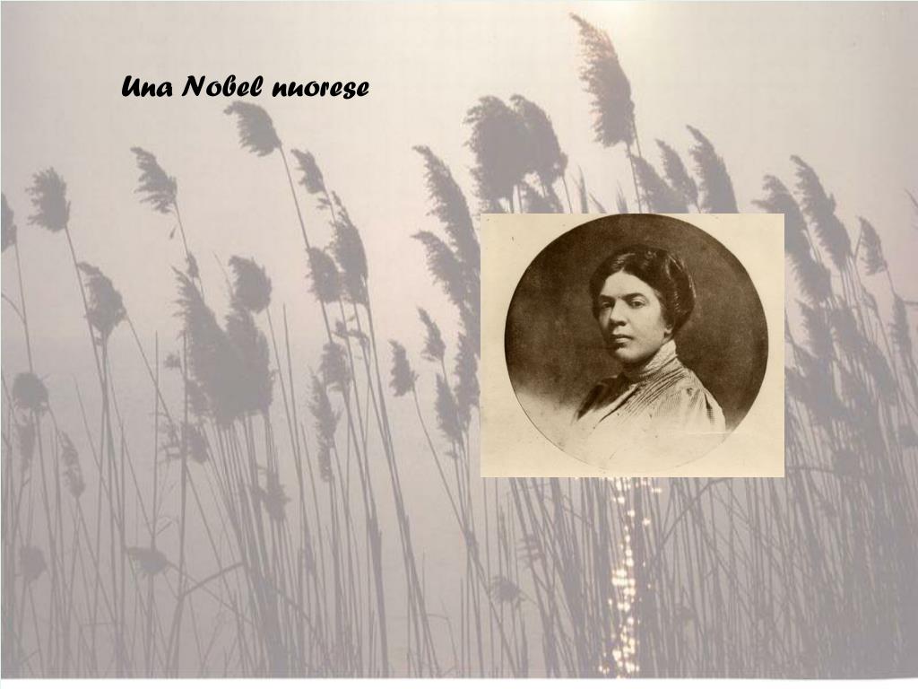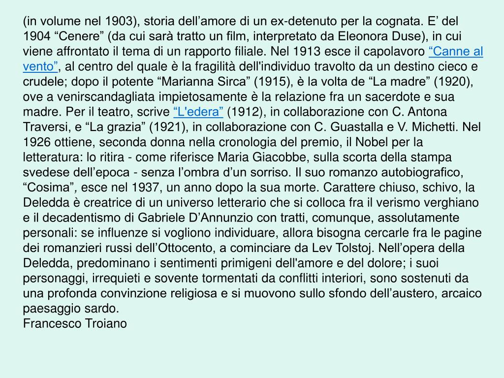 (in volume nel 1903), storia dell’amore di un ex-detenuto per la cognata. E’ del 1904 “Cenere” (da cui sarà tratto un film, interpretato da Eleonora Duse), in cui viene affrontato il tema di un rapporto filiale. Nel 1913 esce il capolavoro “Canne al vento”, al centro del quale è la fragilità dell'individuo travolto da un destino cieco e crudele; dopo il potente “Marianna Sirca” (1915), è la volta de “La madre” (1920), ove a venirscandagliata impietosamente è la relazione fra un sacerdote e sua madre. Per il teatro, scrive “L'edera” (1912), in collaborazione con C. Antona Traversi, e “La grazia” (1921), in collaborazione con C. Guastalla e V. Michetti. Nel 1926 ottiene, seconda donna nella cronologia del premio, il Nobel per la letteratura: lo ritira - come riferisce Maria Giacobbe, sulla scorta della stampa svedese dell’epoca - senza l’ombra d’un sorriso. Il suo romanzo autobiografico, “Cosima”, esce nel 1937, un anno dopo la sua morte. Carattere chiuso, schivo, la Deledda è creatrice di un universo letterario che si colloca fra il verismo verghiano e il decadentismo di Gabriele D’Annunzio con tratti, comunque, assolutamente personali: se influenze si vogliono individuare, allora bisogna cercarle fra le pagine dei romanzieri russi dell’Ottocento, a cominciare da Lev Tolstoj. Nell’opera della Deledda, predominano i sentimenti primigeni dell'amore e del dolore; i suoi personaggi, irrequieti e sovente tormentati da conflitti interiori, sono sostenuti da una profonda convinzione religiosa e si muovono sullo sfondo dell’austero, arcaico paesaggio sardo. Francesco Troiano