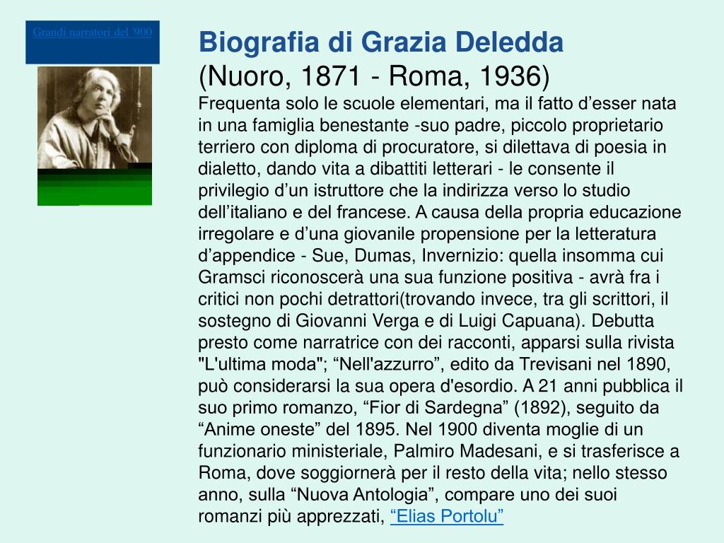 Grandi narratori del '900 Biografia di Grazia Deledda (Nuoro, 1871 - Roma, 1936) Frequenta solo le scuole elementari, ma il fatto d’esser nata in una famiglia benestante -suo padre, piccolo proprietario terriero con diploma di procuratore, si dilettava di poesia in dialetto, dando vita a dibattiti letterari - le consente il privilegio d’un istruttore che la indirizza verso lo studio dell’italiano e del francese. A causa della propria educazione irregolare e d’una giovanile propensione per la letteratura d’appendice - Sue, Dumas, Invernizio: quella insomma cui Gramsci riconoscerà una sua funzione positiva - avrà fra i critici non pochi detrattori(trovando invece, tra gli scrittori, il sostegno di Giovanni Verga e di Luigi Capuana). Debutta presto come narratrice con dei racconti, apparsi sulla rivista "L'ultima moda"; “Nell'azzurro”, edito da Trevisani nel 1890, può considerarsi la sua opera d'esordio. A 21 anni pubblica il suo primo romanzo, “Fior di Sardegna” (1892), seguito da “Anime oneste” del 1895. Nel 1900 diventa moglie di un funzionario ministeriale, Palmiro Madesani, e si trasferisce a Roma, dove soggiornerà per il resto della vita; nello stesso anno, sulla “Nuova Antologia”, compare uno dei suoi romanzi più apprezzati, “Elias Portolu”