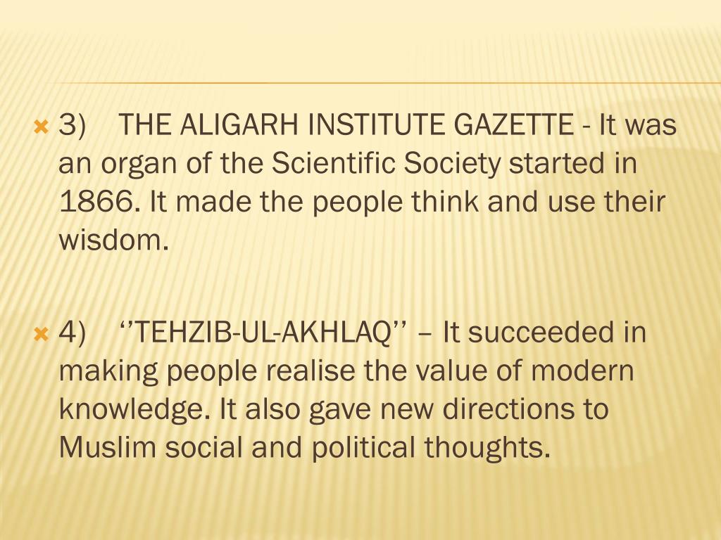 3) THE ALIGARH INSTITUTE GAZETTE - It was an organ of the Scientific Society started in 1866. It made the people think and use their wisdom. 4) ‘’TEHZIB-UL-AKHLAQ’’ – It succeeded in making people realise the value of modern knowledge. It also gave new directions to Muslim social and political thoughts.