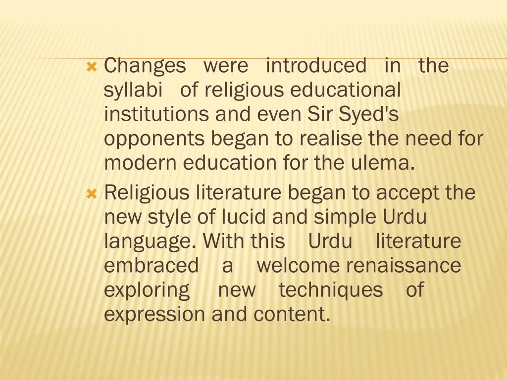 Changes were introduced in the syllabi of religious educational institutions and even Sir Syed's opponents began to realise the need for modern education for the ulema. • Religious literature began to accept the new style of lucid and simple Urdu language. With this Urdu literature embraced a welcome renaissance exploring new techniques of expression and content.