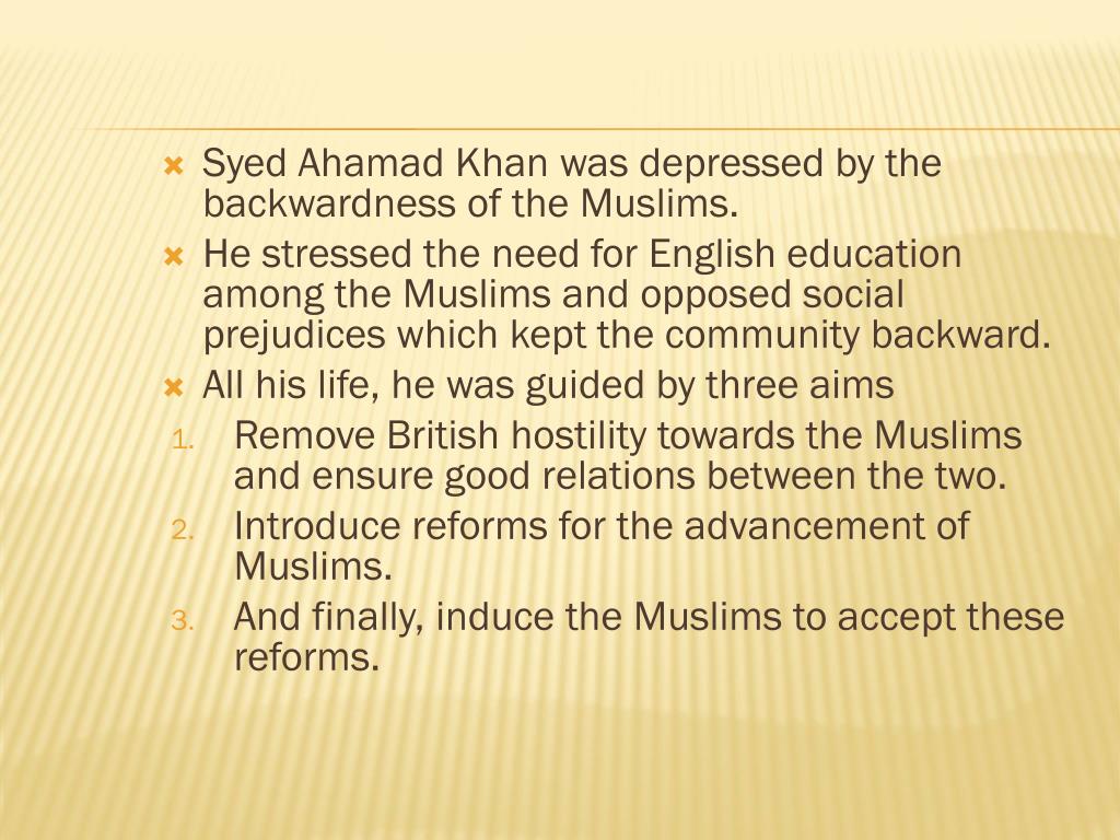 Syed Ahamad Khan was depressed by the backwardness of the Muslims. He stressed the need for English education among the Muslims and opposed social prejudices which kept the community backward. All his life, he was guided by three aims Remove British hostility towards the Muslims and ensure good relations between the two. Introduce reforms for the advancement of Muslims. And finally, induce the Muslims to accept these reforms.