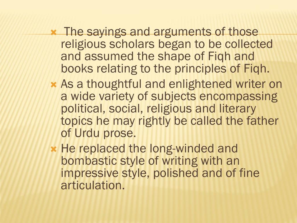The sayings and arguments of those religious scholars began to be collected and assumed the shape of Fiqh and books relating to the principles of Fiqh. As a thoughtful and enlightened writer on a wide variety of subjects encompassing political, social, religious and literary topics he may rightly be called the father of Urdu prose. He replaced the long-winded and bombastic style of writing with an impressive style, polished and of fine articulation.