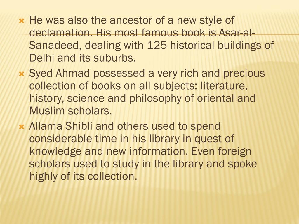 He was also the ancestor of a new style of declamation. His most famous book is Asar-al- Sanadeed, dealing with 125 historical buildings of Delhi and its suburbs. Syed Ahmad possessed a very rich and precious collection of books on all subjects: literature, history, science and philosophy of oriental and Muslim scholars. AllamaShibli and others used to spend considerable time in his library in quest of knowledge and new information. Even foreign scholars used to study in the library and spoke highly of its collection.