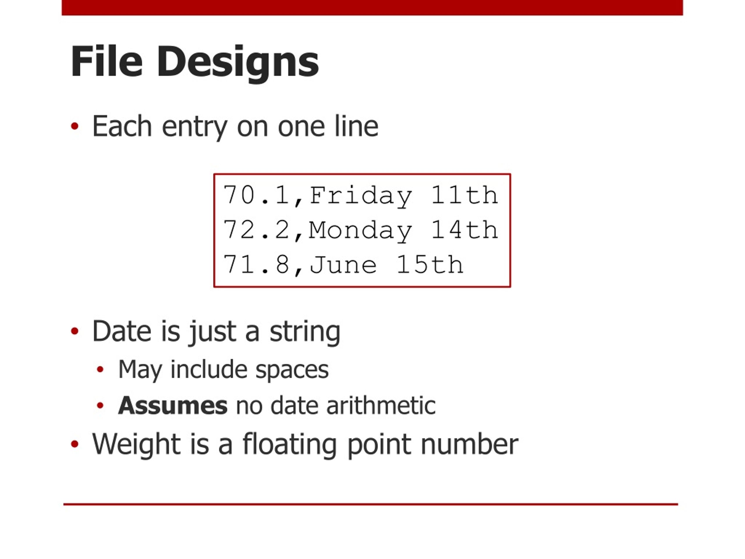 File Designs • Each entry on one line • Date is just a string • May include spaces • Assumes no date arithmetic • Weight is a floating point number 70.1,Friday 11th 72.2,Monday 14th 71.8,June 15th
