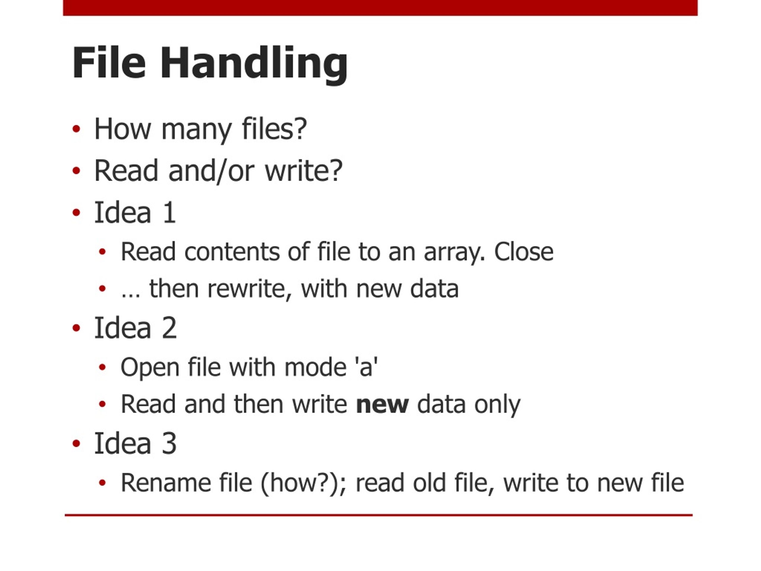 File Handling • How many files? • Read and/or write? • Idea 1 • Read contents of file to an array. Close • … then rewrite, with new data • Idea 2 • Open file with mode 'a' • Read and then write new data only • Idea 3 • Rename file (how?); read old file, write to new file