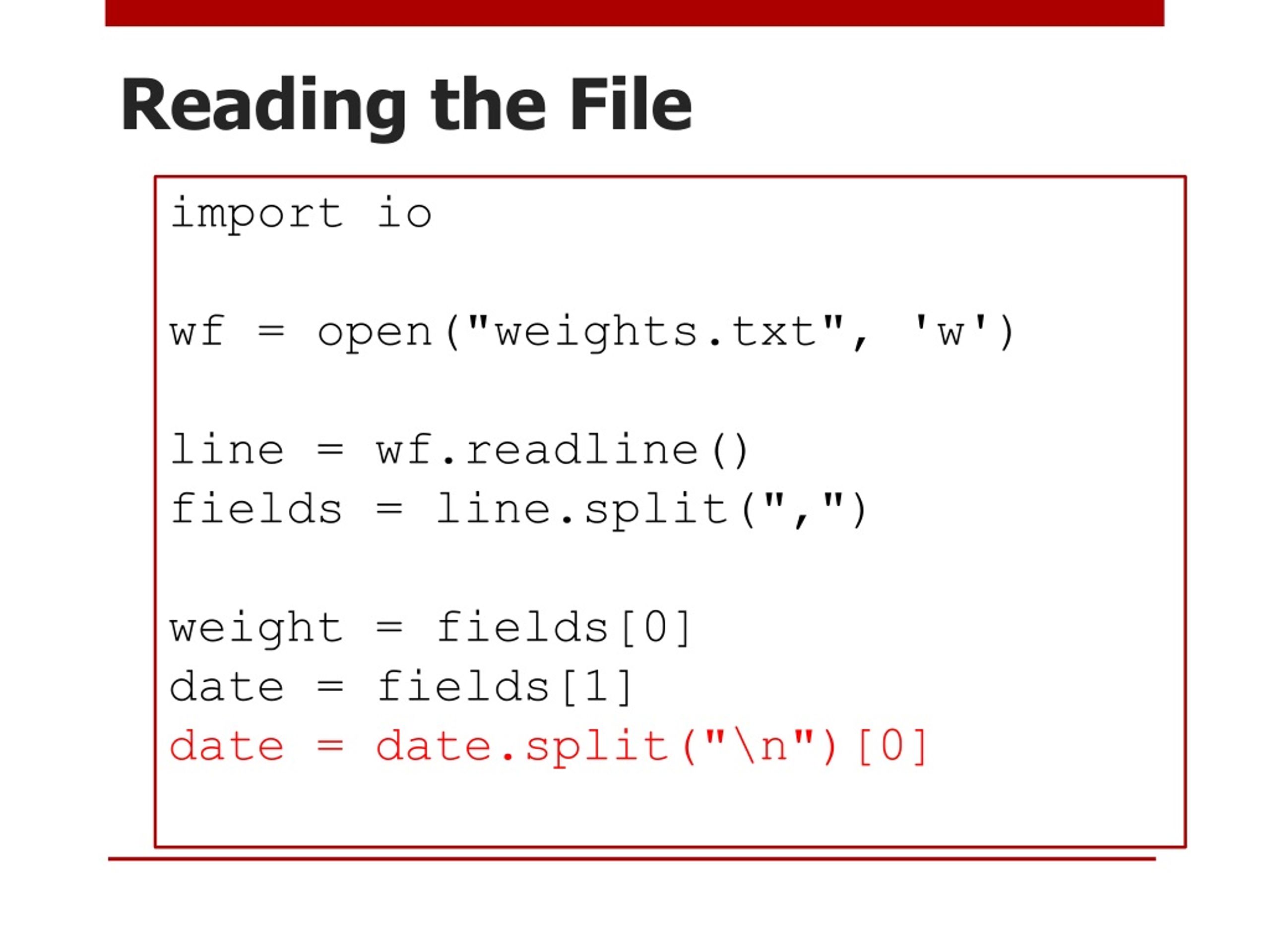 Reading the File import io wf = open("weights.txt", 'w') line = wf.readline() fields = line.split(",") weight = fields[0] date = fields[1]